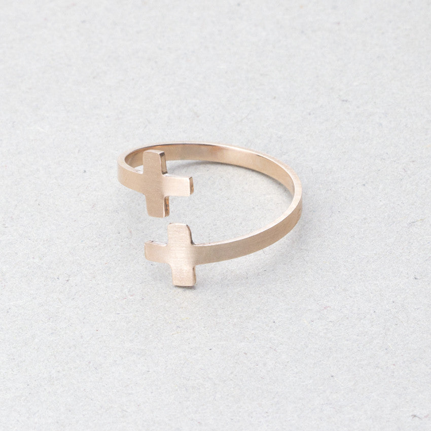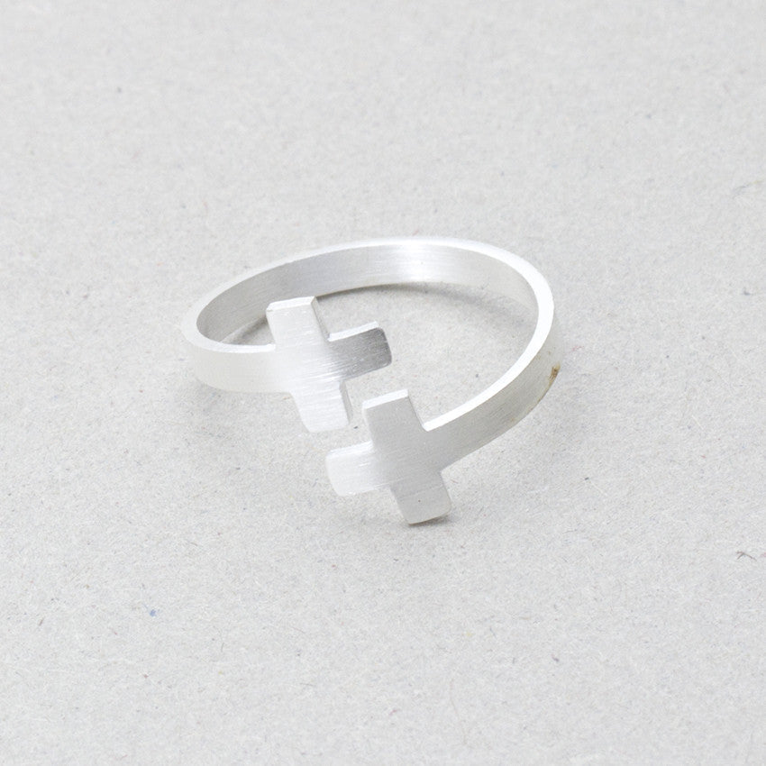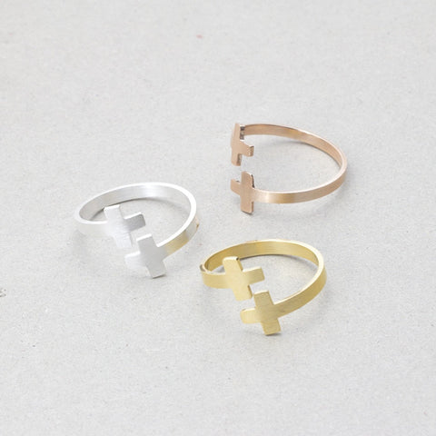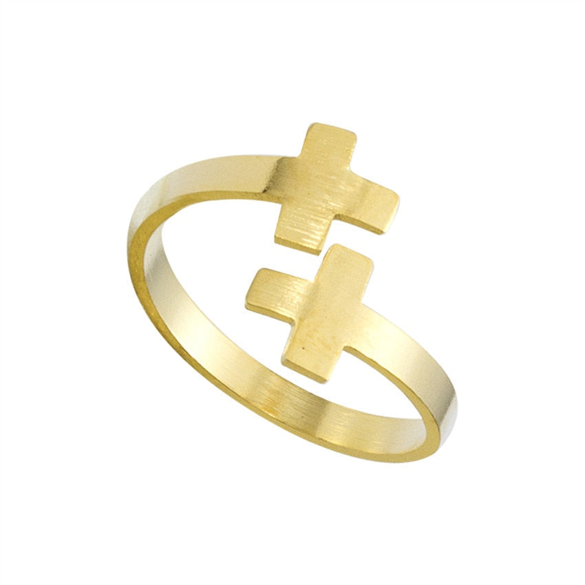 Anel religioso de alta qualidade em aço inoxidável. Duas cruzes cristãs finamente polidas unem-se e envolvem o dedo para máximo conforto e estabilidade. Este anel é de tamanho único e pode ser ajustado manualmente com uma leve pressão, adaptando-se elegantemente a qualquer dedo. Use no seu dedo toda a proteção e amor de Cristo.