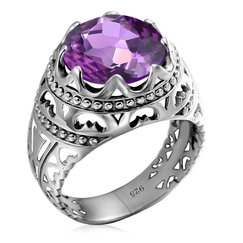 Este anel com uma autêntica pedra de ametista é uma joia deslumbrante. O anel de prata é feito de prata de lei 925 e possui uma bela pedra de ametista no centro. A pedra de ametista foi lapidada em forma oval e está engastada no anel. O anel tem um acabamento polido e seria um presente maravilhoso para alguém especial.