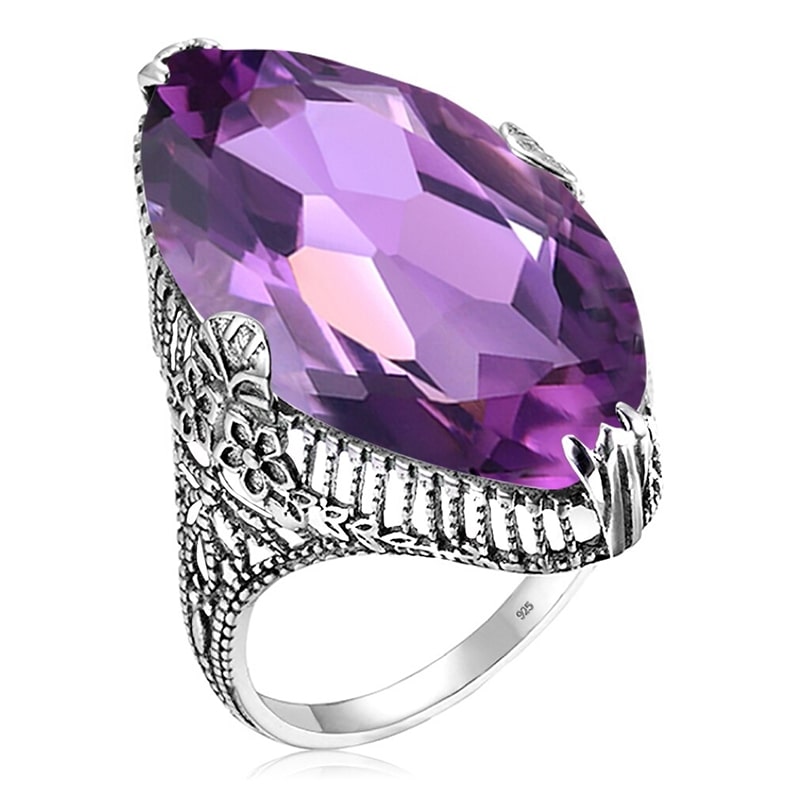 Este elegante anel de prata é a forma perfeita de adicionar um toque de luxo ao seu estilo do dia a dia. O anel é feito de prata de lei 925 e possui uma grande pedra de ametista no centro. A ametista tem uma bela cor violeta que simboliza realeza, poder e dignidade.