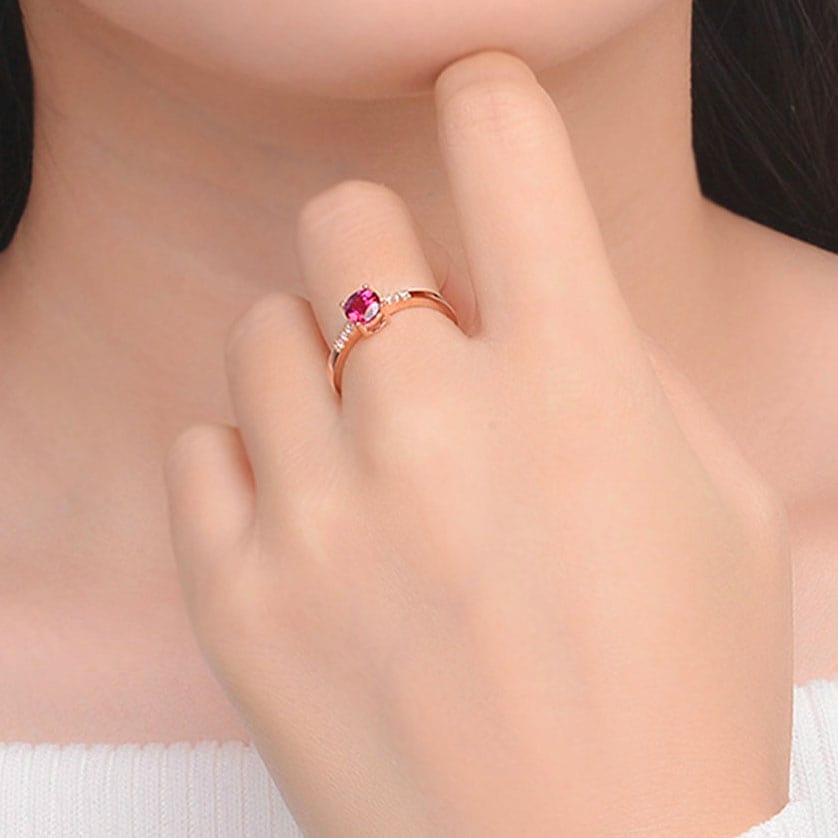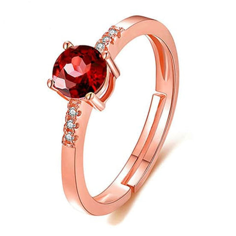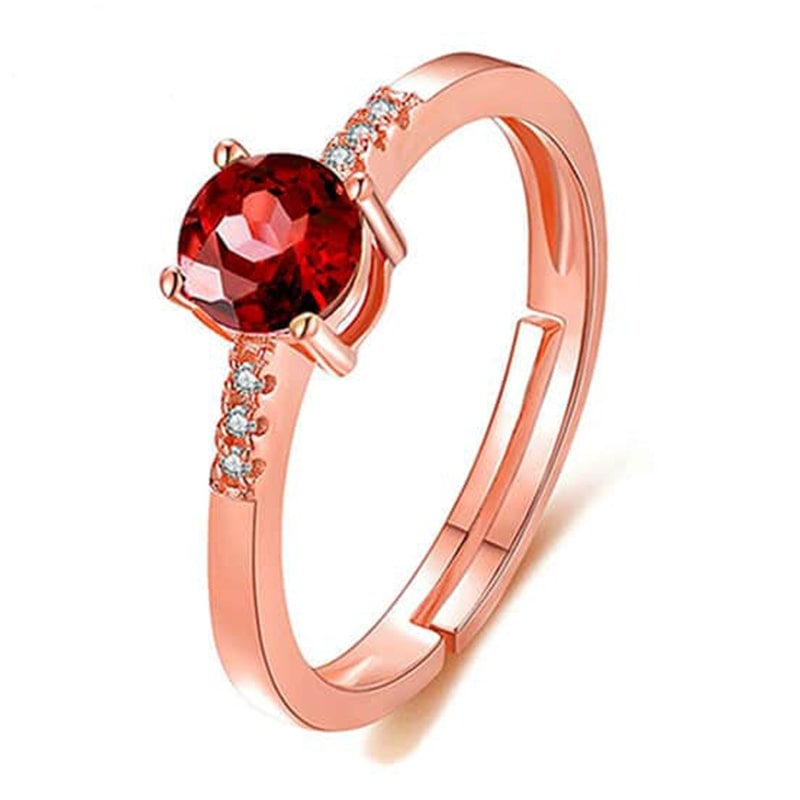 Este belo anel em ouro rosa apresenta uma pedra de granada autêntica e única. A granada vermelha ajuda a controlar a raiva, especialmente dirigida a si mesmo. É uma pedra de compromisso e também simboliza o amor.