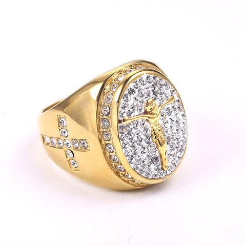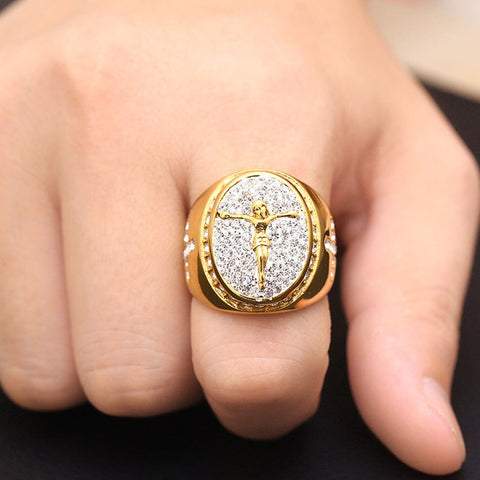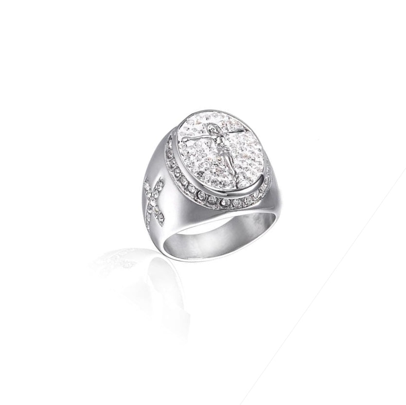 Anel religioso de alta qualidade com Jesus Cristo. A imagem de Cristo crucificado, rodeada por pedras de strass, está gravada na parte frontal do anel sinete. Em cada lado deste elegante e sofisticado anel sinete encontra-se uma cruz cristã adornada com pedras de strass. Use no dedo a proteção e o amor de Cristo em cada momento do seu dia.