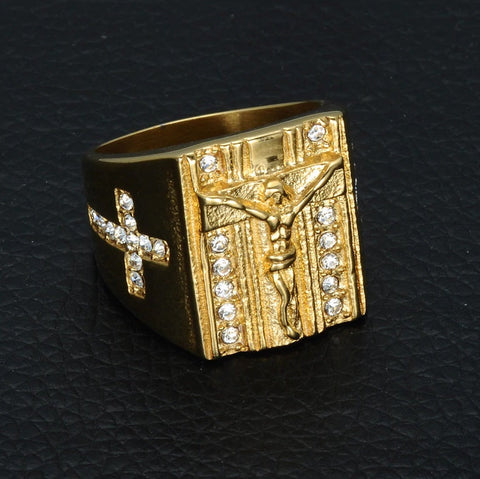 Anel religioso que representa Jesus Cristo na cruz, simbolizando a sua coragem e o seu sacrifício por nós. Ao redor da cruz e nas laterais do anel encontram-se enfeites de strass que formam cruzes cristãs. Toda a proteção e amor de Cristo no seu dedo.
