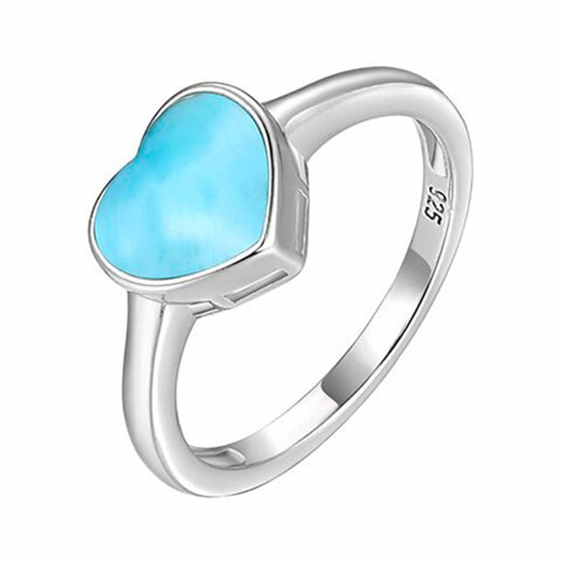 Este deslumbrante anel de prata com uma pedra de larimar traz energia ao seu estilo. Este anel encantador é perfeito para todas as mulheres que desejam destacar-se da multidão. A pedra de larimar tem a forma de um coração e uma bela cor azul.