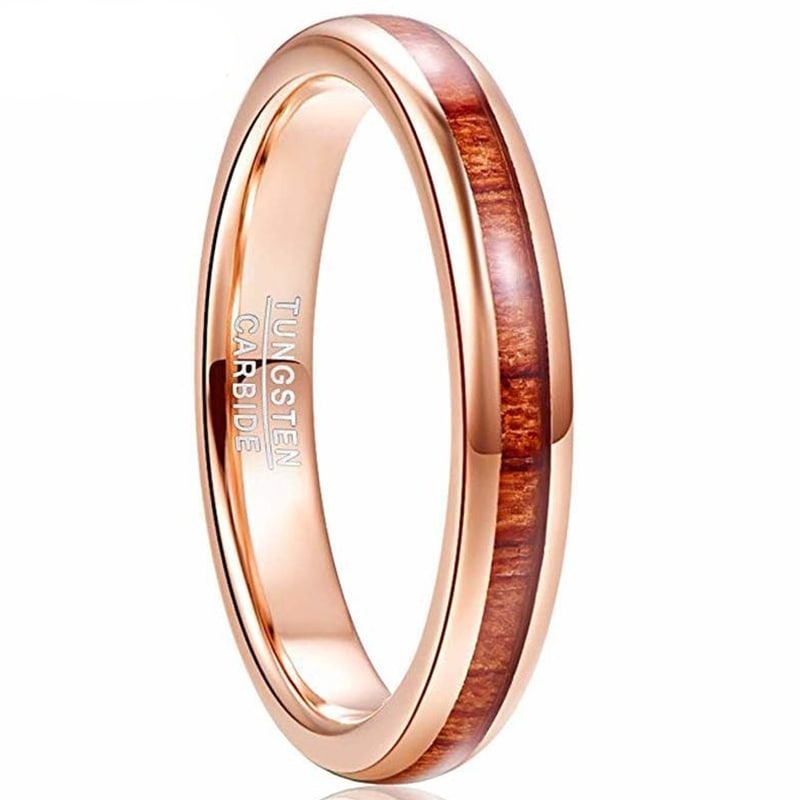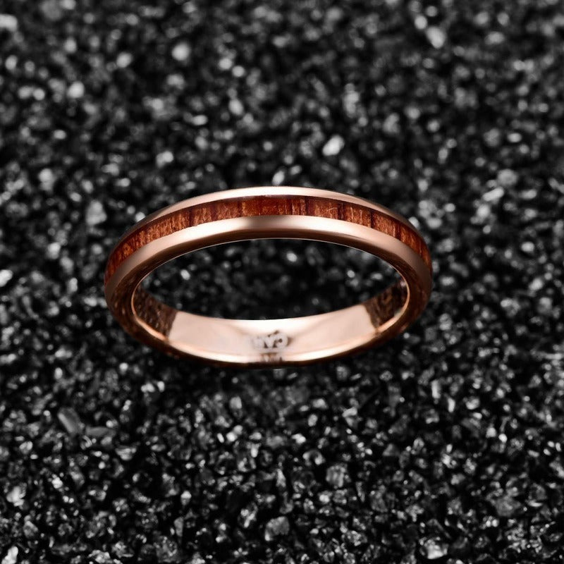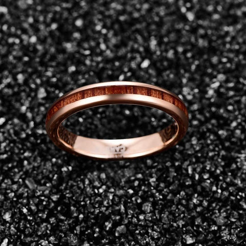 Anel elegante de madeira e ouro rosa com um estilo sofisticado.