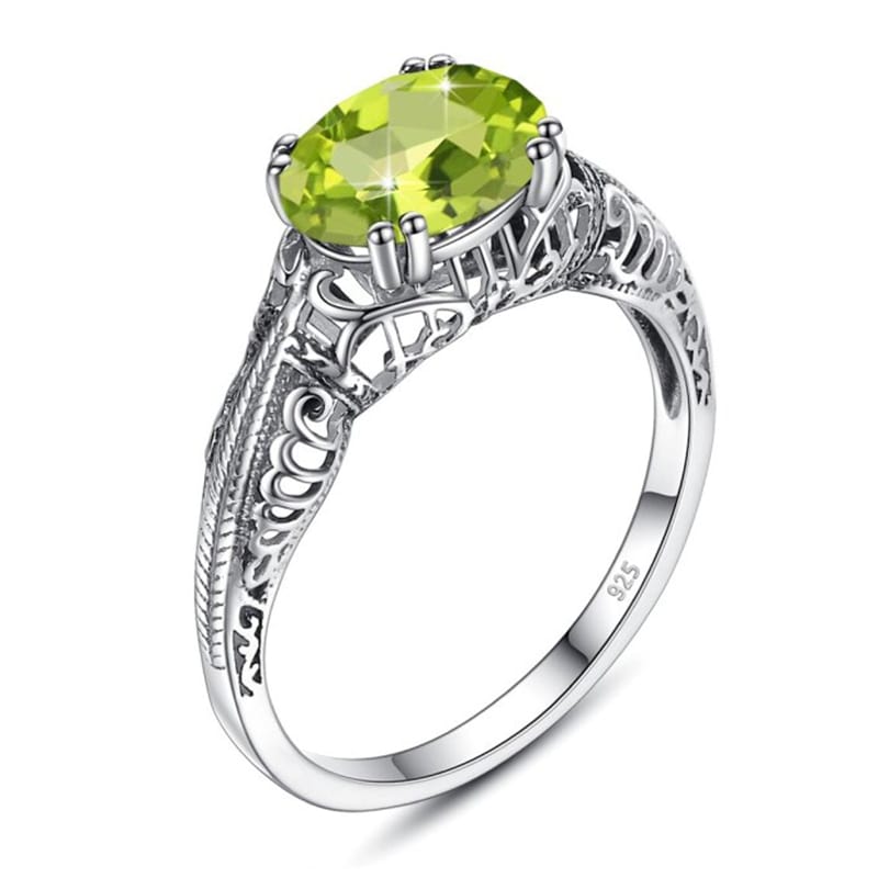 Apresentamos um anel deslumbrante com peridoto natural. Este anel magnífico é a forma perfeita de adicionar um toque de elegância a qualquer visual. A faixa de prata apresenta uma gravação delicada com um padrão floral, com uma pedra de peridoto brilhante no centro.