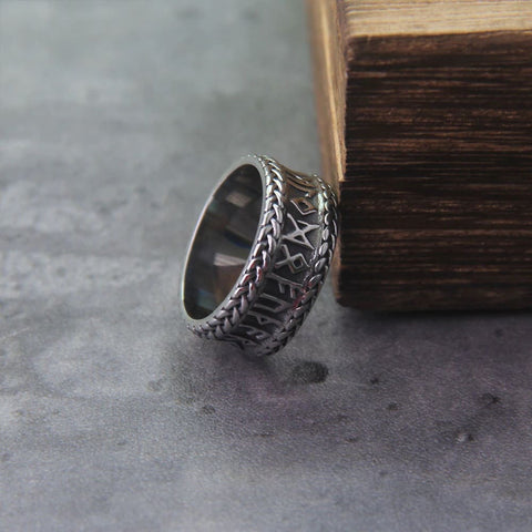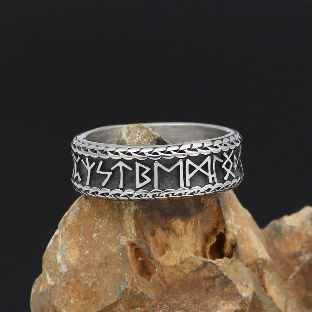 As runas ao redor do anel provêm do alfabeto rúnico Futhark. Este antigo alfabeto nórdico era utilizado em pedras rúnicas e inscrições. Foi amplamente usado no Norte da Europa durante a Era Viking. Ainda hoje, estas letras misteriosas são associadas a propriedades mágicas de proteção. As runas eram tradicionalmente usadas em rituais de adivinhação para prever o futuro ou afastar feitiços malignos.