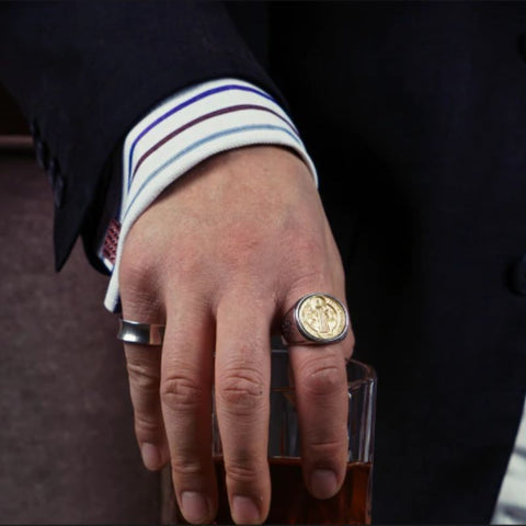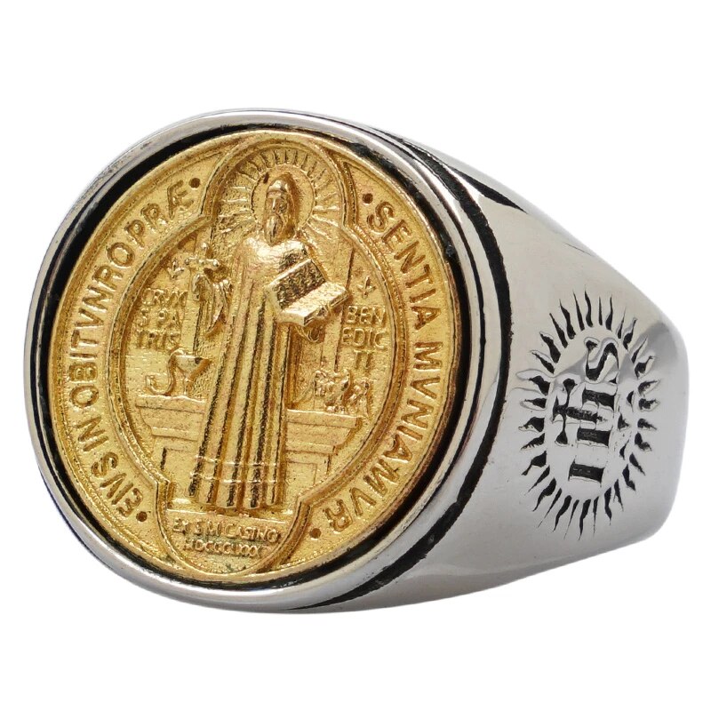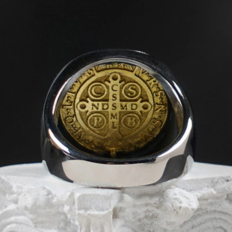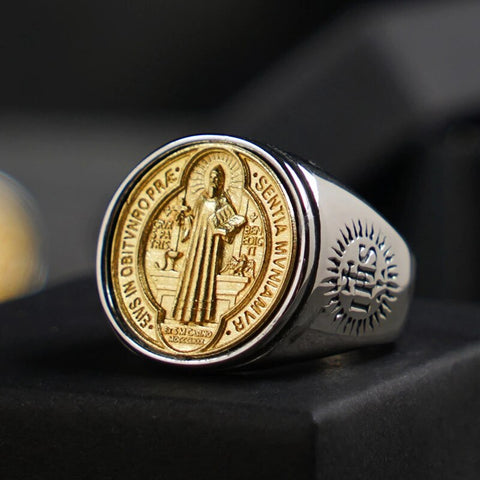 Este anel de sinete católico apresenta uma faixa dourada redonda com a imagem fiel de São Bento. Esta joia cuidadosamente gravada reflete com elegância a sua pertença religiosa e confere-lhe um estilo sofisticado para qualquer ocasião. Feito em aço inoxidável, este anel não enferruja nem perde a cor com o tempo.