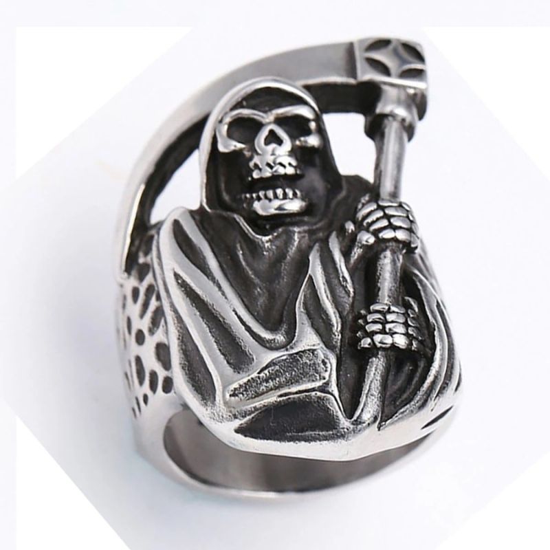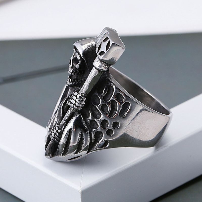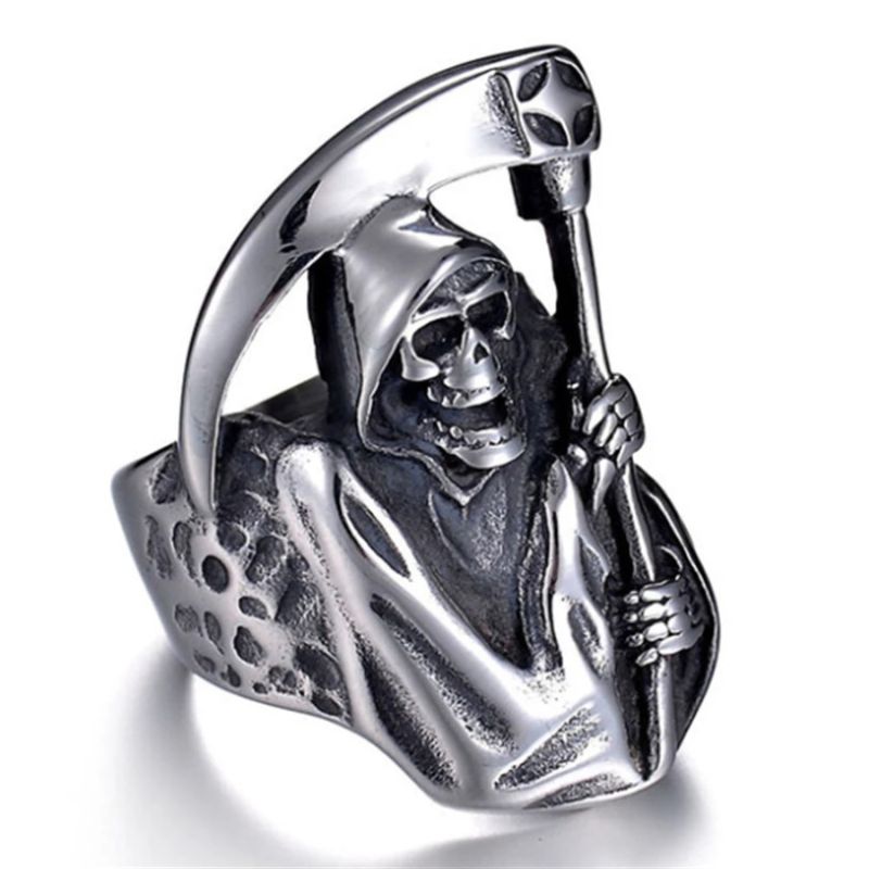Este anel de sinete em aço é uma joia gótica original, com uma reprodução fiel do crânio do Ceifeiro. Fabricada em aço inoxidável, esta peça não enferruja nem perde a cor com o tempo.