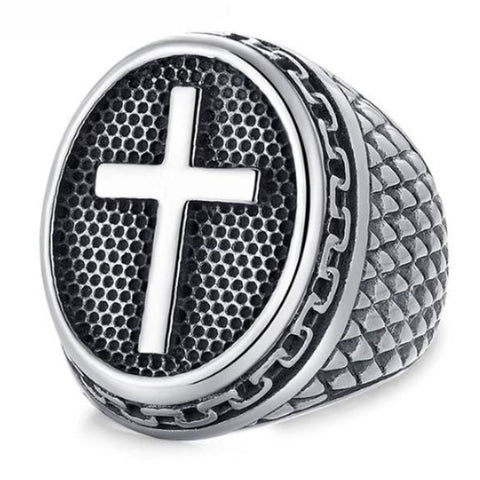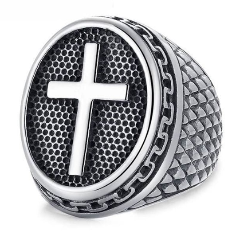 Este deslumbrante anel de sinete apresenta uma superfície oval adornada com uma cruz cristã. O anel é decorado com entalhes geométricos que lhe conferem um visual tradicional. Este anel de sinete combina perfeitamente com outras joias religiosas, como um terço.
