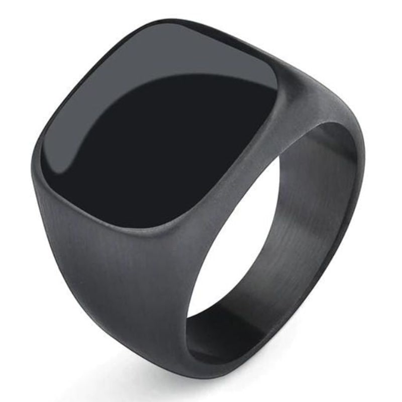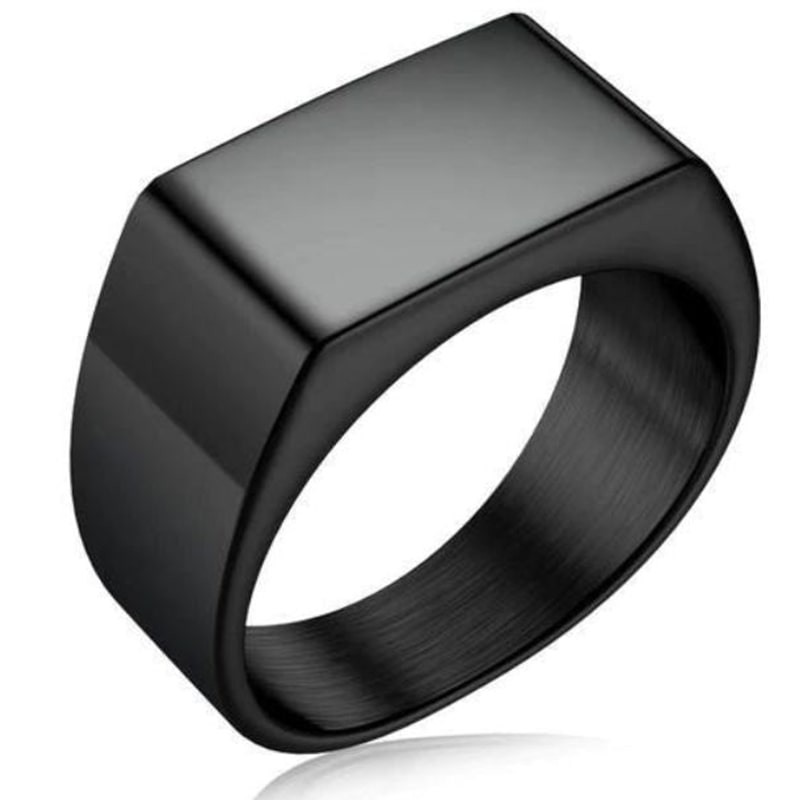 Este bonito anel sinete preto está disponível em 4 formas geométricas diferentes (retângulo, quadrado, hexágono ou irregular). O design elegante torna-o uma peça moderna que complementa facilmente qualquer visual. A joia é feita de aço inoxidável preto. A superfície não enferruja nem desbota com o tempo.
