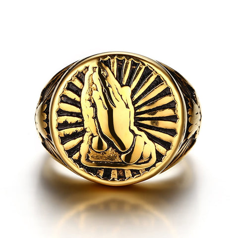 Deixa-te seduzir por este anel religioso de alta qualidade, feito de liga de zinco dourada com acabamento polido. Na parte frontal do anel de sinete estão gravadas mãos em oração, e nas laterais, corações que te lembram de todo o amor que Jesus sente por ti. Toda a proteção e amor de Cristo no teu dedo.