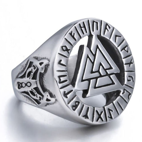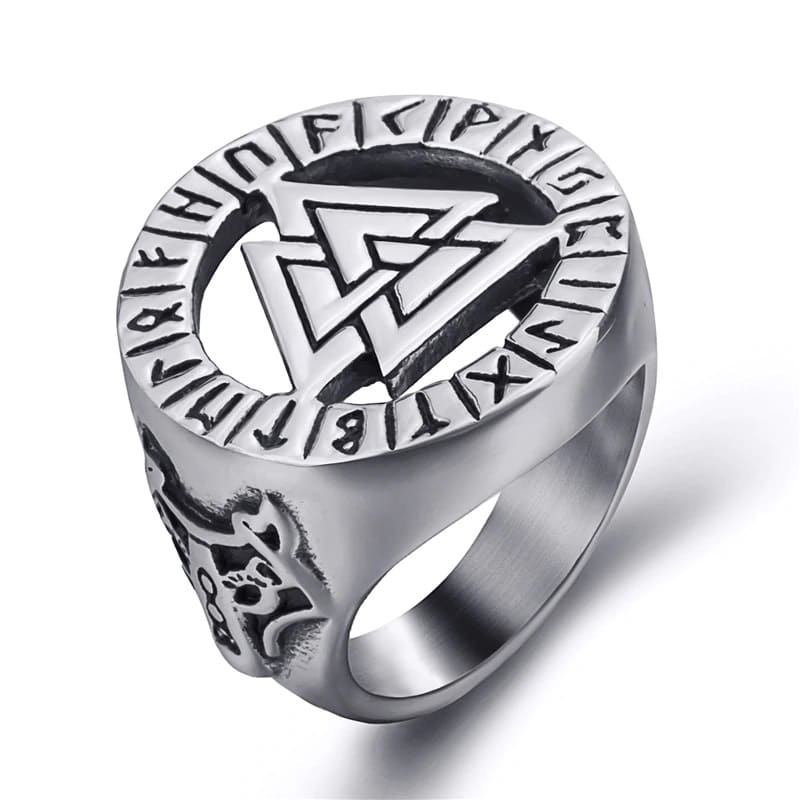 A parte superior deste anel de sinete apresenta o símbolo Valknut. Nas laterais está gravado o emblema do terrível Fenrir. Este anel de sinete foi forjado para guerreiros chamados a ocupar o seu lugar ao lado de Odin. Junta-te às fileiras dos guerreiros de Odin com este anel de sinete Valknut.
