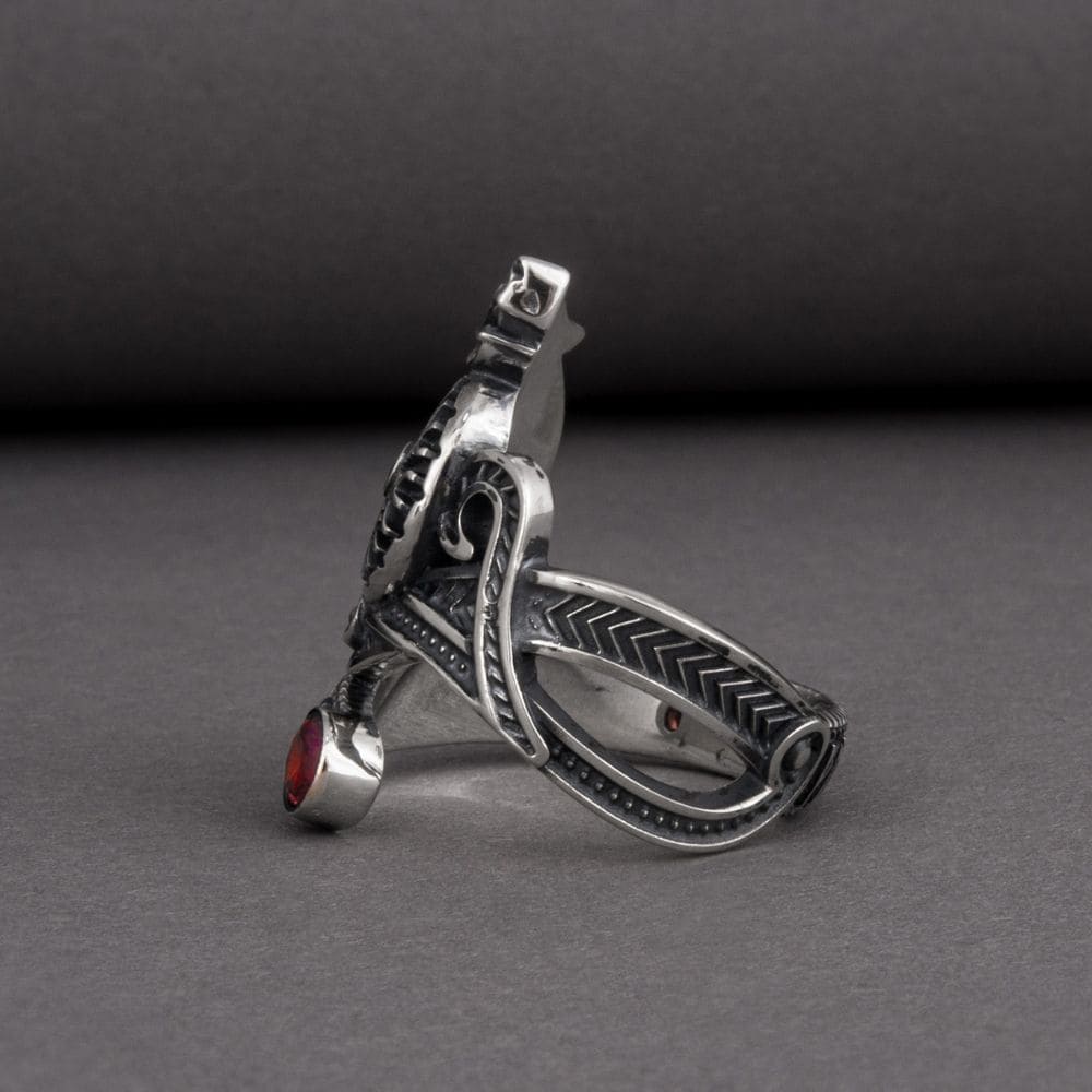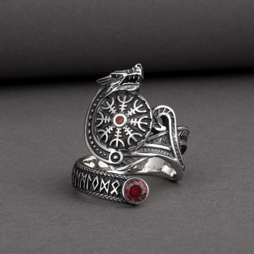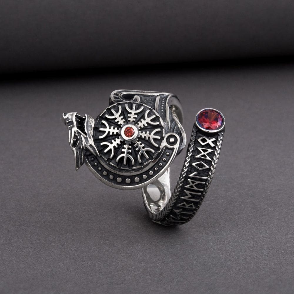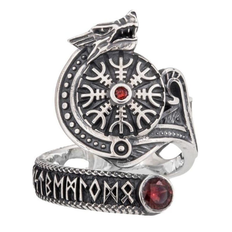 Manifeste o poder do lobo Fenrir com este anel adornado com a cabeça de lobo e o símbolo Aegishjalmur. Este anel de prata também é decorado com uma inscrição rúnica mágica. Duas pedras vermelhas acrescentam um toque único a esta joia excecional.