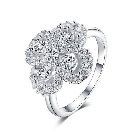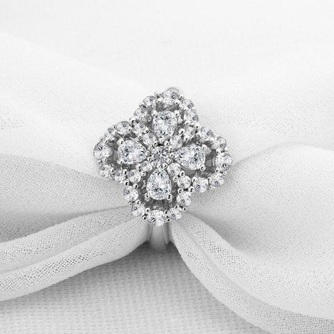Este é o nosso anel floral de ouro branco e diamantes de alta qualidade. A sua deslumbrante composição de pequenos diamantes sintéticos brancos forma uma flor bonita e radiante. O ajuste deste anel é regulável, adaptando-se perfeitamente à sua falange.