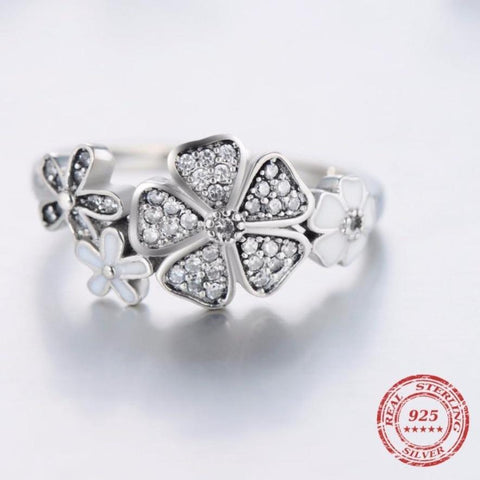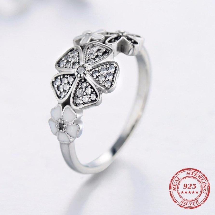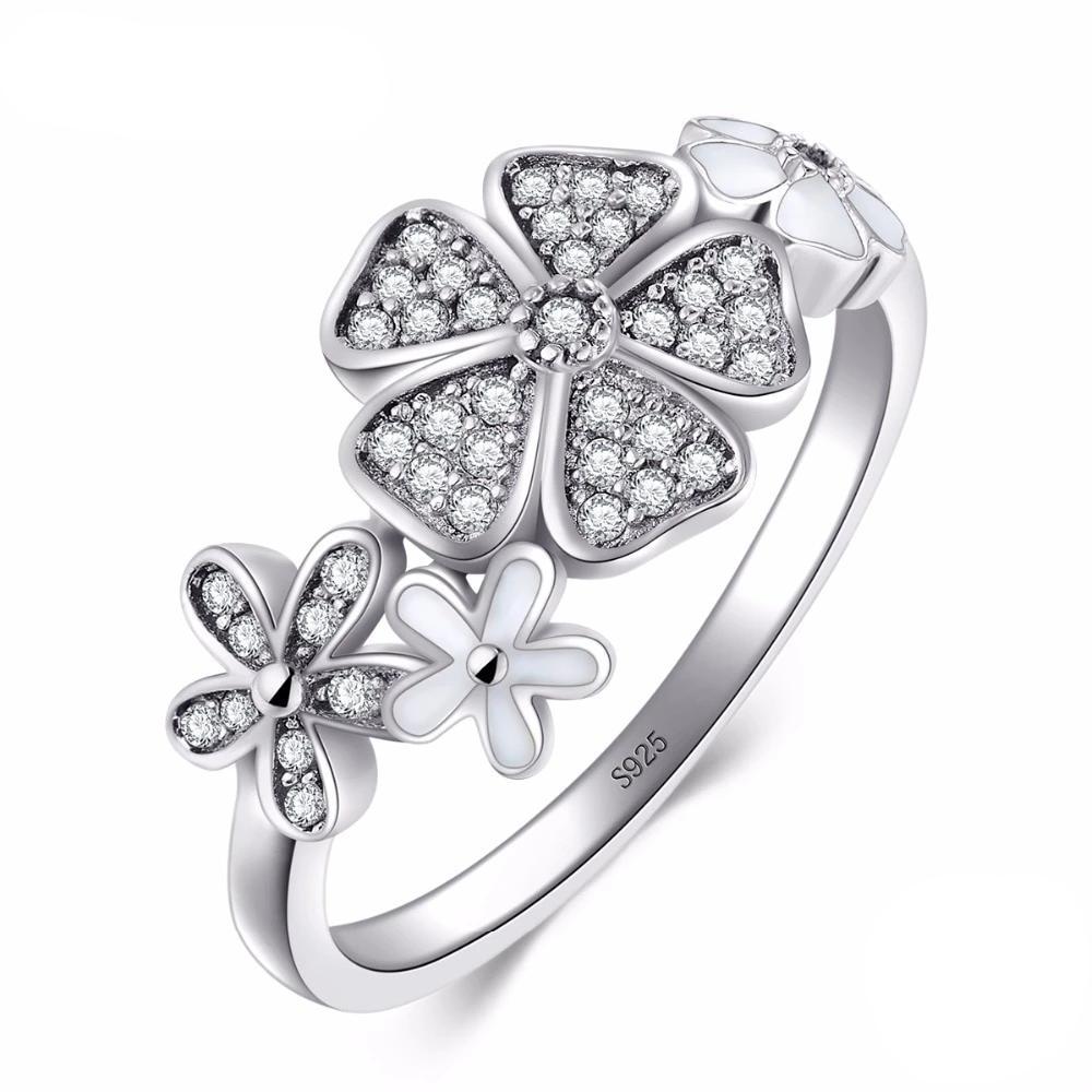 Este anel de alta qualidade possui uma montagem encantadora e elegante em prata maciça polida, com pequenas flores delicadas. É uma joia leve e fácil de usar, perfeita para combinar com diversos estilos.
