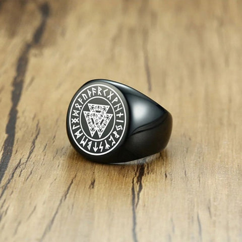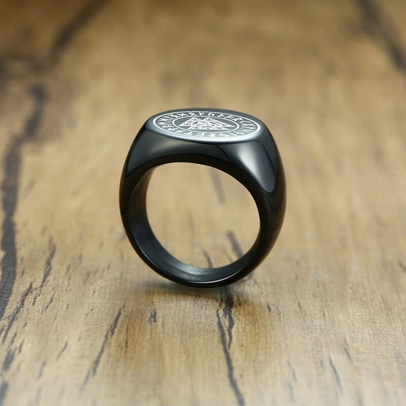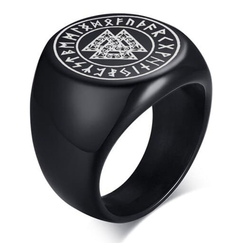Este anel preto com o símbolo Valknut foi concebido para refletir o laço sagrado entre os vikings e o deus Odin. É adornado com o Valknut, símbolo dos guerreiros caídos. As runas sagradas acrescentam um toque autêntico escandinavo. O estilo moderno e único deste anel torna-o adequado para qualquer ocasião.