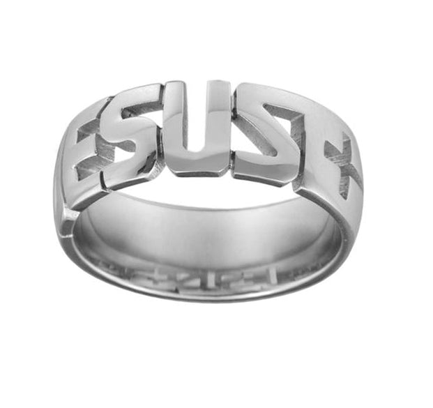 Anel religioso de Jesus em aço inoxidável de alta qualidade. O nome Jesus está delicadamente esculpido num estilo moderno e contemporâneo. Uma cruz cristã está gravada nas laterais com alta temperatura. Use no dedo a proteção e o amor completos de Cristo.