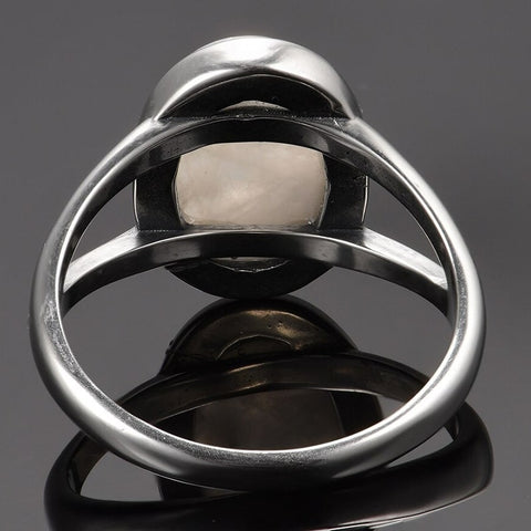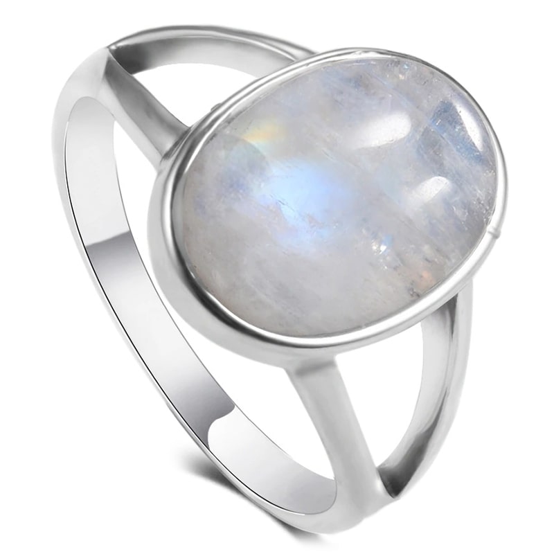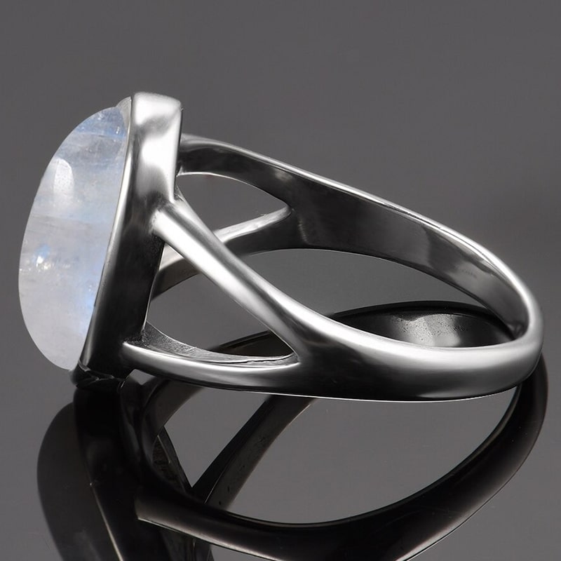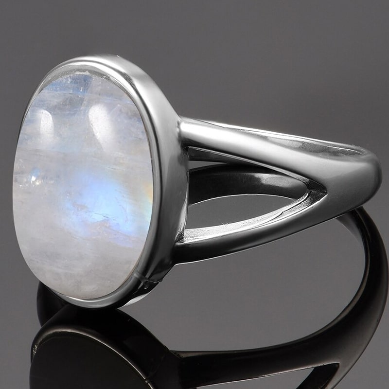 Anel luxuoso de pedra da lua branca, elegante e sofisticado.