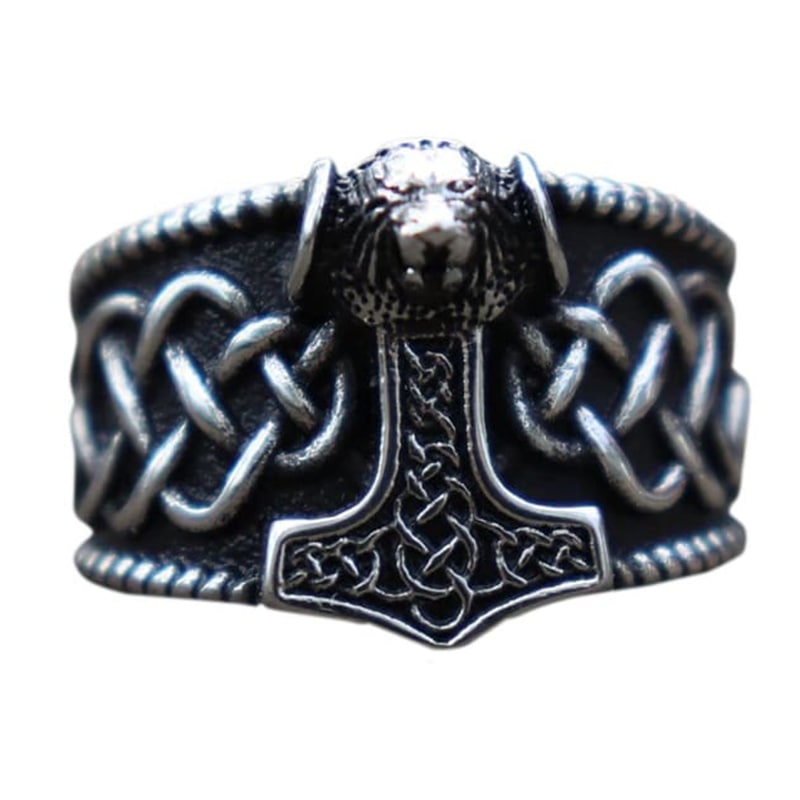 Decore o seu dedo com este anel viking que simboliza o martelo do deus Thor. O anel apresenta o martelo do deus do trovão e a cabeça de um leão, símbolos de força e coragem. O design é completado com motivos entrelaçados de estilo nórdico.