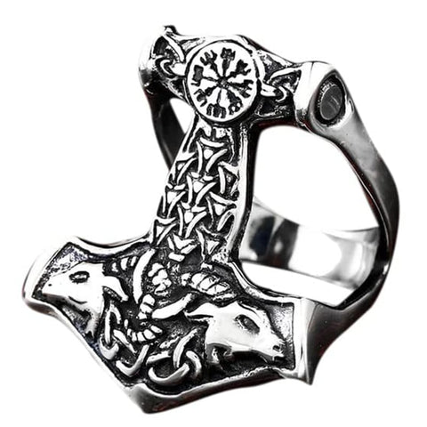 Decora a tua mão com o temível martelo Mjölnir, a arma protetora de Midgard. A superfície deste anel de Mjölnir está gravada com as cabeças das duas cabras fiéis de Thor, Tanngrisnir e Tanngnjóstr.