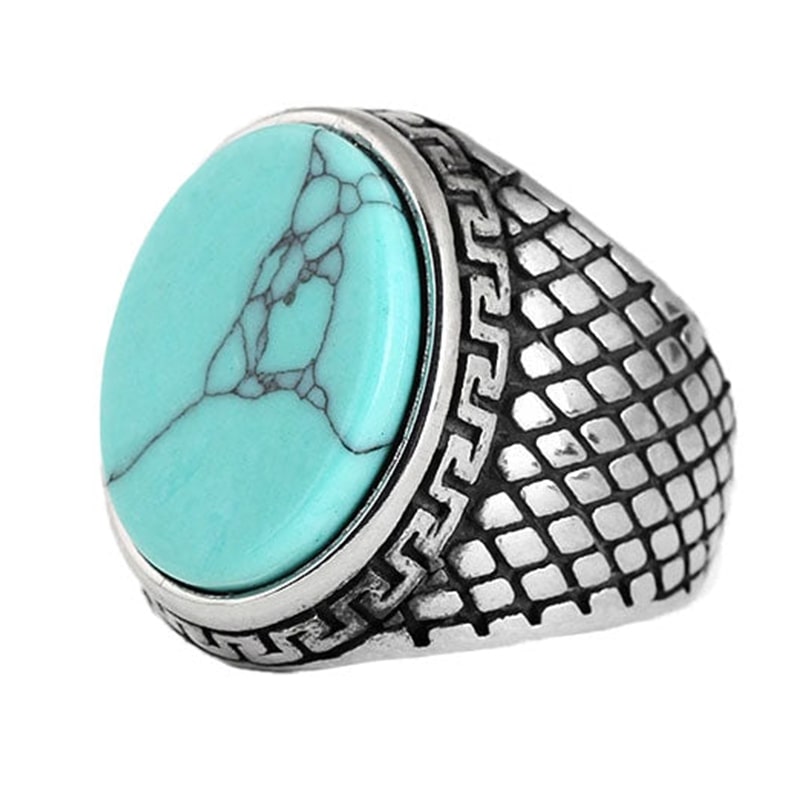 Este deslumbrante anel com pedra de turquesa é uma peça indispensável para qualquer coleção rara de joias. Fabricado em aço inoxidável, o anel apresenta uma vibrante pedra de turquesa central que certamente encantará todos os que a virem.