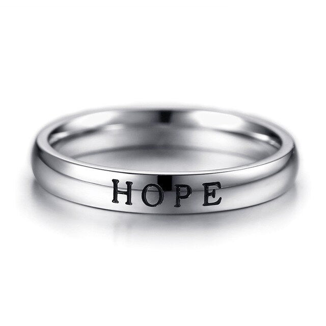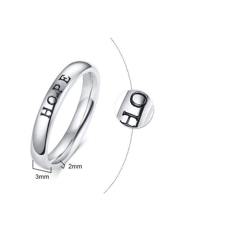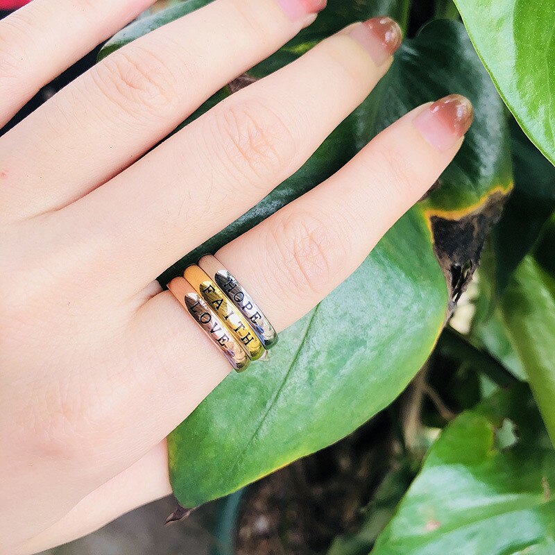 Estes anéis foram cuidadosamente gravados com diferentes palavras que refletem diretamente a sua fé cristã. No anel prateado está gravada a palavra "Hope" (Esperança), no anel dourado a palavra "Faith" (Fé) e no anel rosa a palavra "Love" (Amor). Como a esperança, a fé e o amor estão sempre presentes em si quando os seus pensamentos se voltam para Deus, estes anéis deslumbrantes são um símbolo supremo e discreto da força da sua fé em Deus.