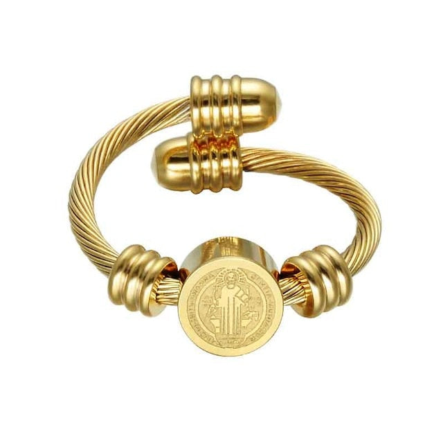 Deixe-se seduzir por este deslumbrante anel religioso de alta qualidade, feito em aço inoxidável dourado. O tamanho do anel é ajustável, adaptando-se com elegância a qualquer dedo. Apresenta uma imagem finamente gravada de Cristo. Uma joia elegante com uma elegância intemporal – todo o amor e proteção de Cristo no seu dedo.