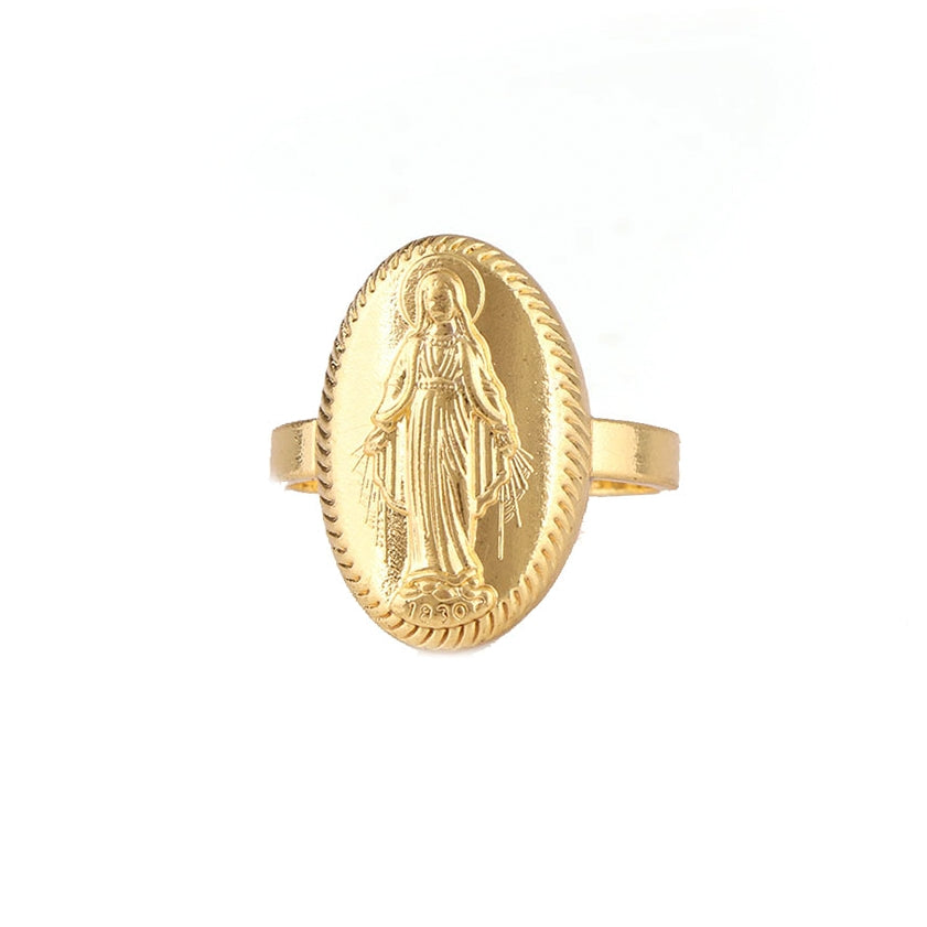 Deixe-se seduzir por este magnífico anel religioso que representa a Virgem Maria, Mãe de Deus. Anel ajustável feito de aço inoxidável dourado de alta qualidade. A Virgem está esculpida com grande detalhe e o anel é adornado com inscrições. O anel é ajustável manualmente e adapta-se a qualquer tamanho de dedo. Uma joia elegante com um toque de intemporalidade.