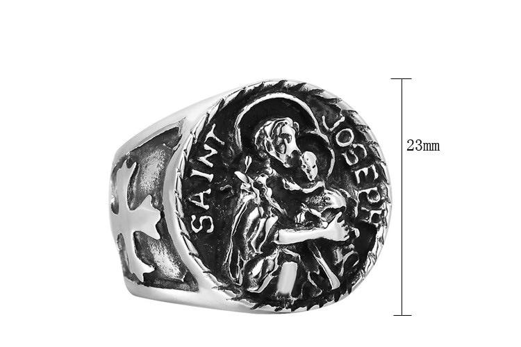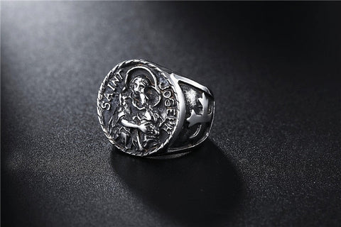 Deixe-se seduzir por este magnífico anel religioso, finamente gravado com a imagem de São José, o padroeiro das causas perdidas.