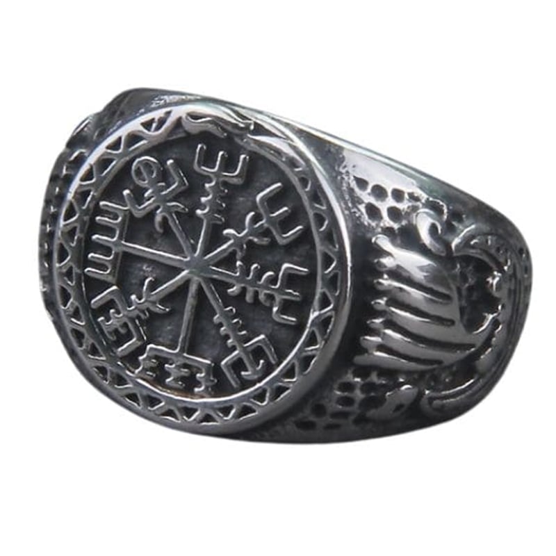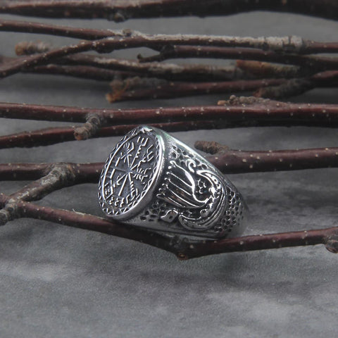 Este anel de aço é um acessório de moda original para uso diário. A superfície do anel é decorada com o símbolo do Vegvisir. Nas laterais, encontram-se dois navios nórdicos.