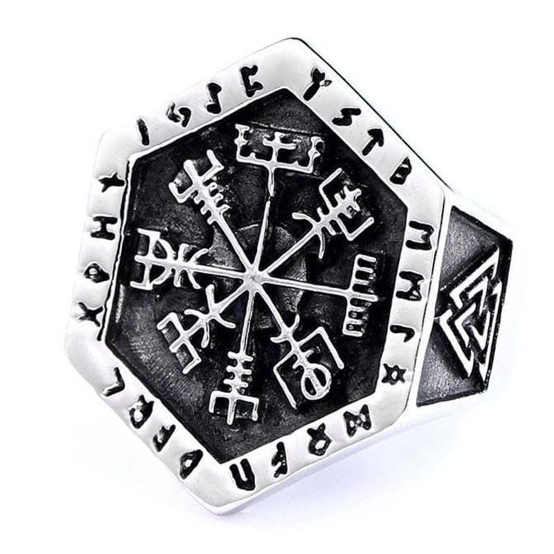 O símbolo Vegvisir gravado neste anel com emblemas e runas mágicas ajudava os viajantes a encontrar o caminho ou a manter o rumo durante viagens perigosas no mar.