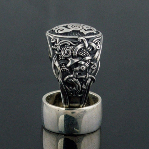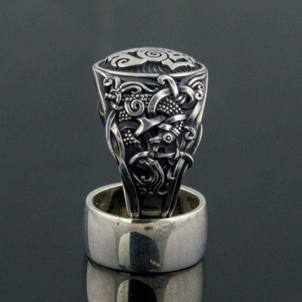 O anel de cavalo Sleipnir é feito da mais fina prata de lei. A peça é adornada com magníficos motivos escandinavos, inspirados no estilo artístico de Mammen.