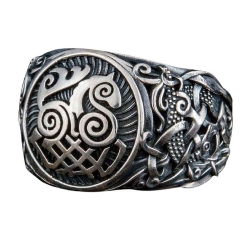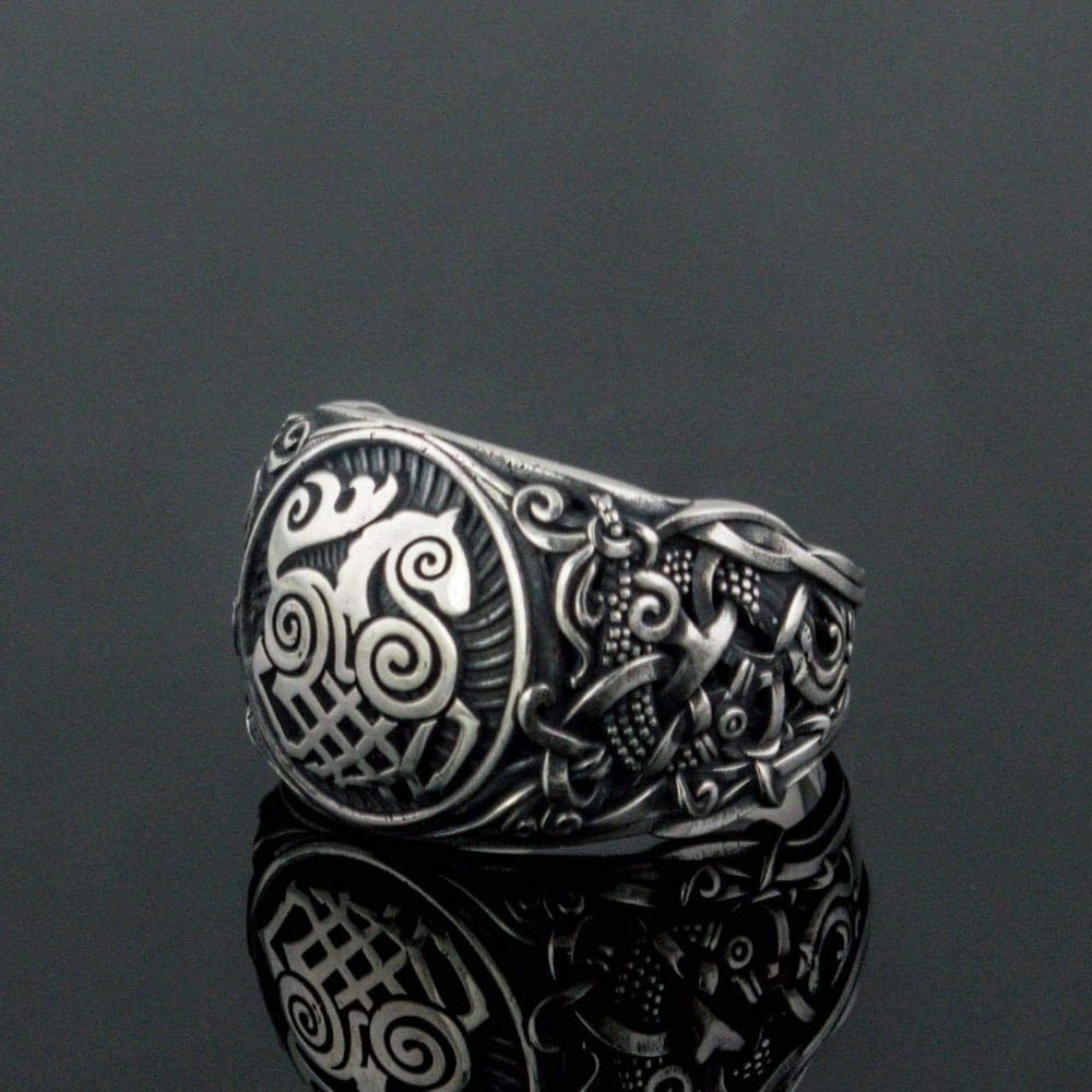 Este anel de prata apresenta Sleipnir, o mítico cavalo mágico do deus Odin. O cavalo de Odin, representado neste anel, tinha oito patas e a capacidade de cavalgar sobre a água e pelo ar.