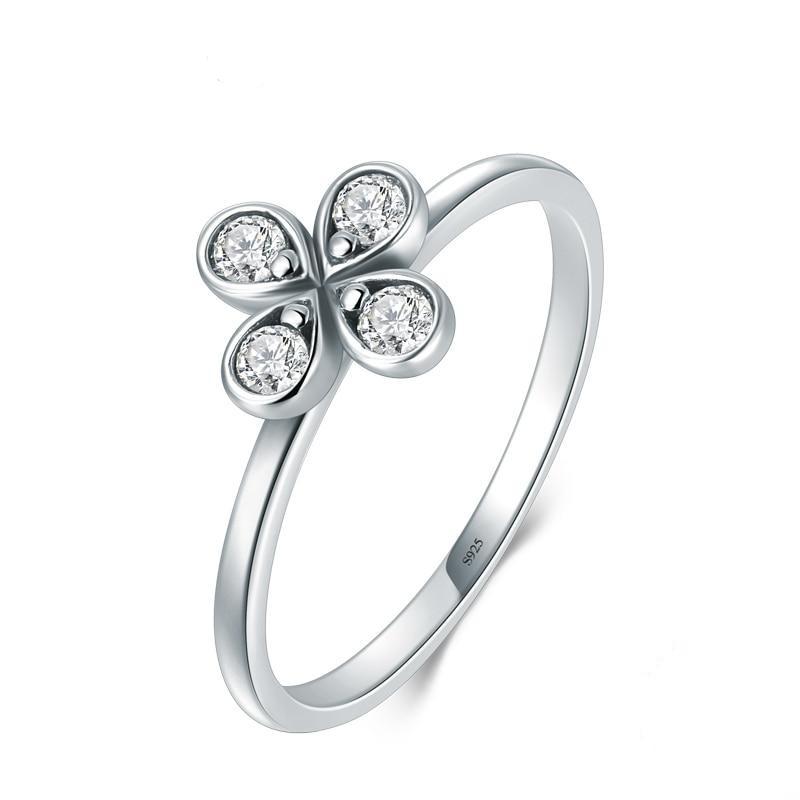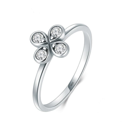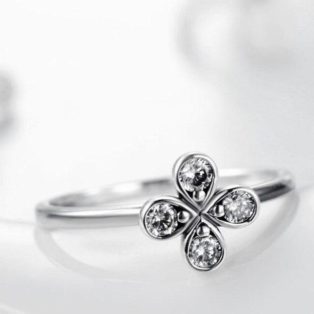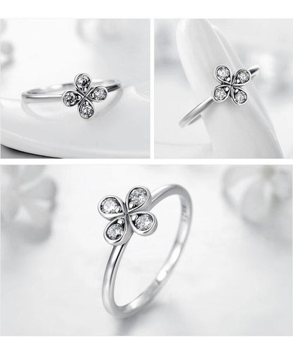 Este anel apresenta uma montagem em prata de lei polida e um pequeno trevo de quatro folhas que traz sorte. O trevo é decorado com cristais cintilantes deslumbrantes, conferindo-lhe um visual elegante e encantador.