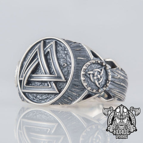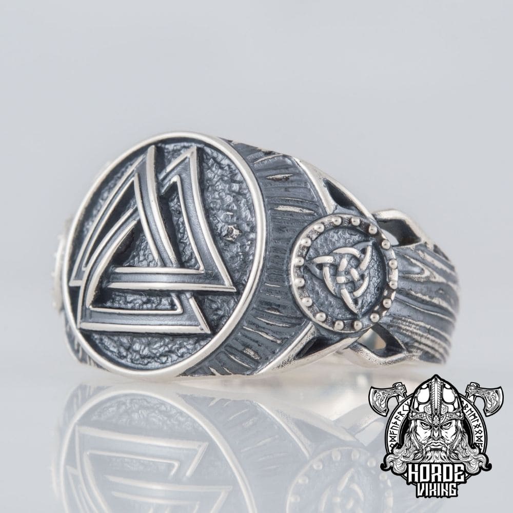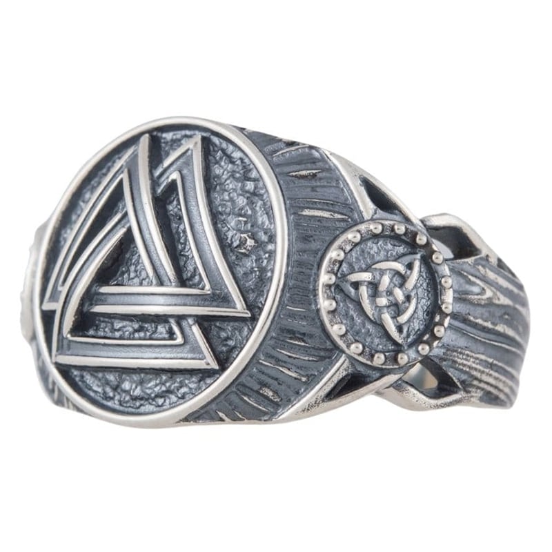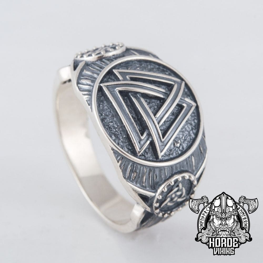 Este anel maciço de prata está decorado com o símbolo Valknut. Este símbolo, composto por três triângulos entrelaçados, é o emblema supremo de um guerreiro viking. Foi encontrado em pedras rúnicas autênticas. Representa os guerreiros de Odin, que se sentam à sua mesa em Valhala.