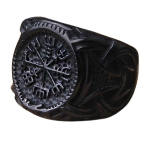 Este anel preto em aço inoxidável é adornado com o símbolo viking Vegvisir. Este antigo símbolo nórdico de proteção é composto por oito braços que apontam para diferentes direções da bússola.