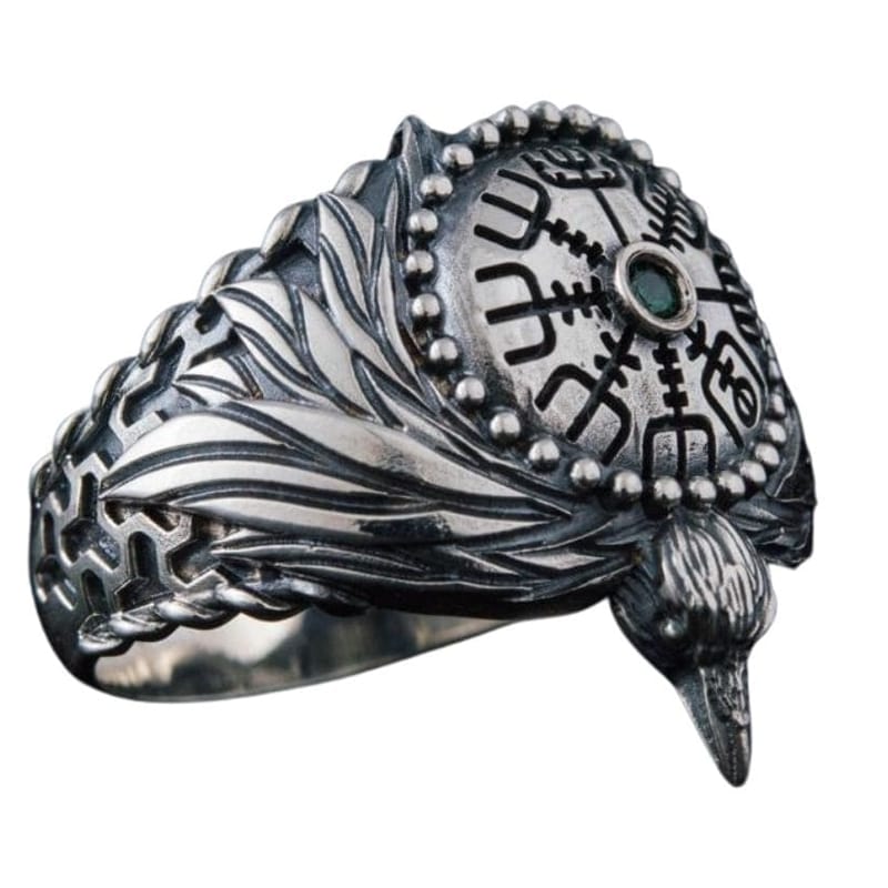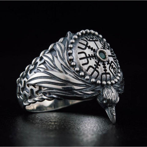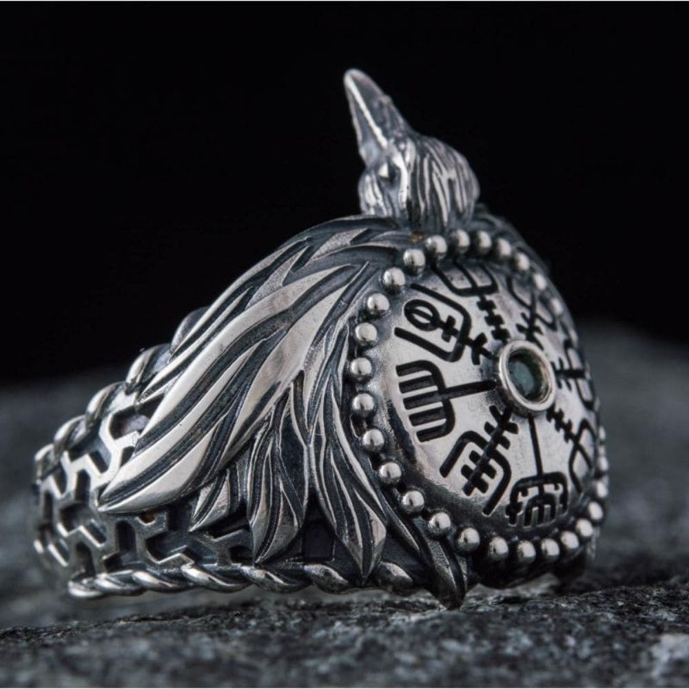 Este anel de corvo em prata de qualidade excecional apresenta um corvo com as asas abertas, transportando nas costas o símbolo Vegvisir dos vikings.