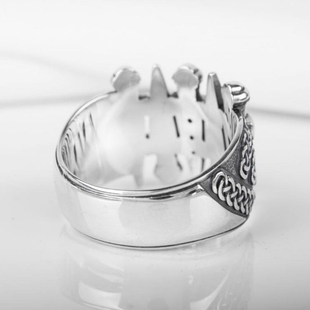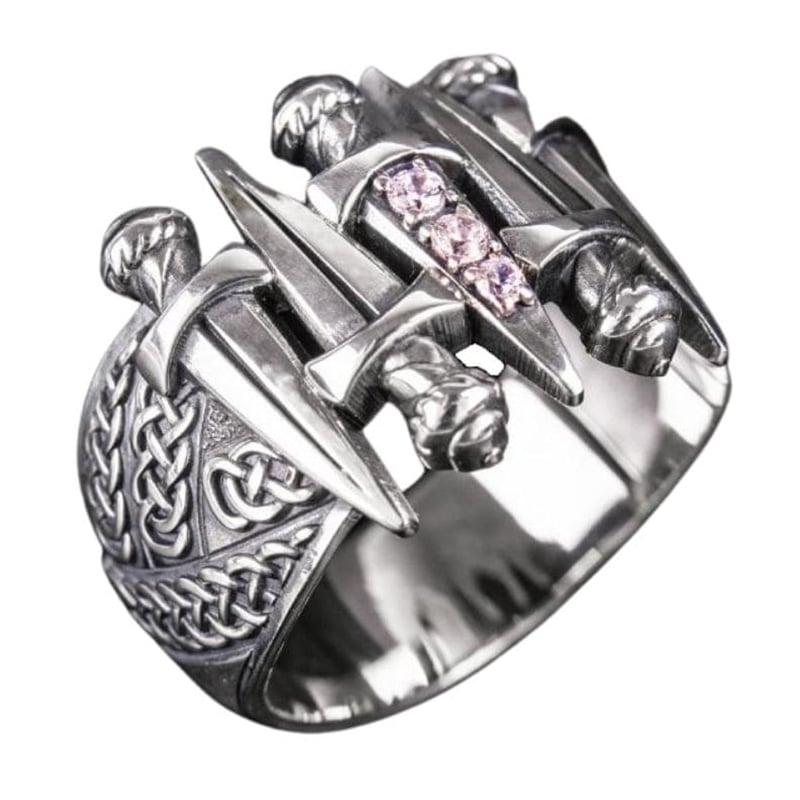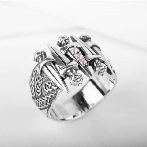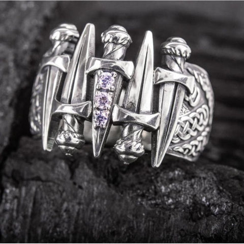 Este anel de prata apresenta cinco adagas. O anel é também adornado com padrões escandinavos entrelaçados.