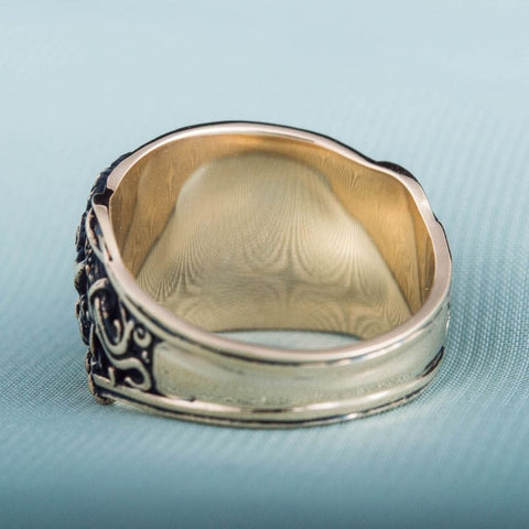 Este anel de bronze maciço é decorado com o símbolo dos Três Chifres de Odin. Na mitologia nórdica, Odin usou estes três chifres para recolher o hidromel mágico que lhe deu o poder de se tornar poeta.