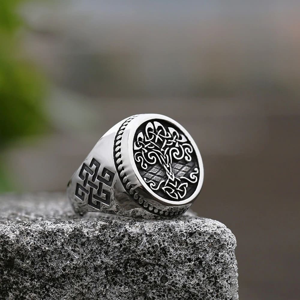 Honre a natureza e o equilíbrio do cosmos com este anel único que simboliza a árvore Yggdrasil.