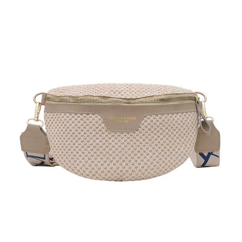 Para mulheres que procuram um acessório elegante e funcional para o verão, esta bolsa de cintura bege é a escolha perfeita. Fabricada em palha e couro vegetal, esta bolsa acrescenta um toque de sofisticação e elegância aos teus looks de verão.