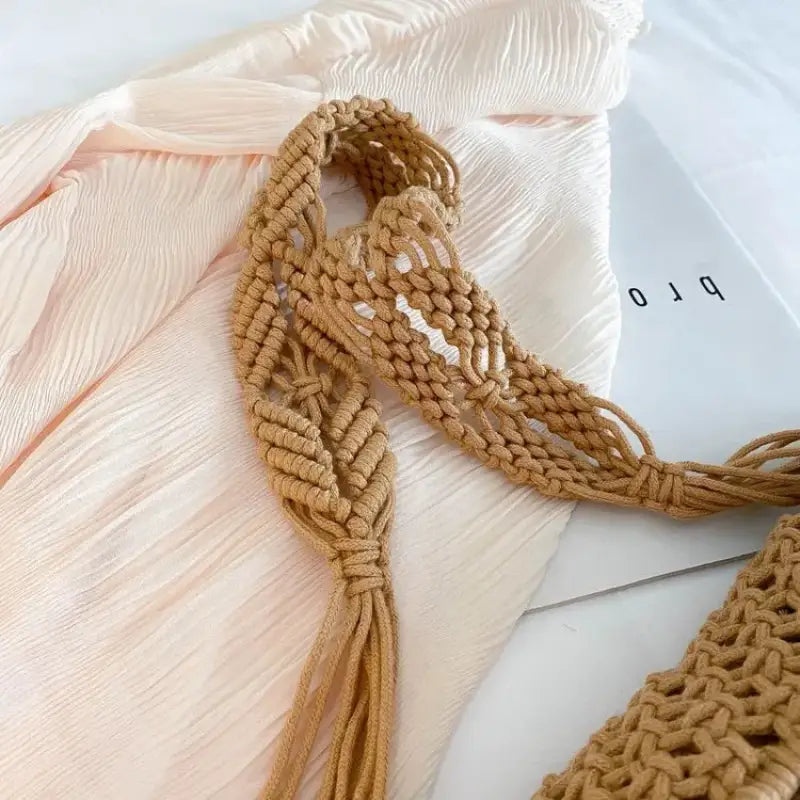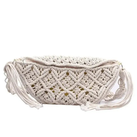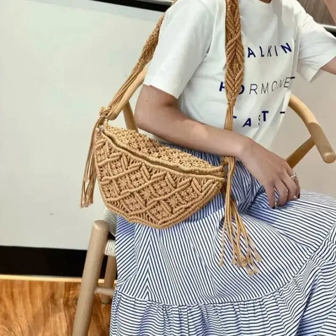 Esta bolsa de cintura para mulher é feita à mão com fio de algodão, o que lhe confere um visual em malha muito na moda. É a favorita das mulheres que procuram um visual natural e simples. Este acessório é ideal para quem deseja uma bolsa de cintura elegante, descontraída e funcional. É perfeita para adicionar um toque boémio aos seus looks de verão, mantendo os seus essenciais sempre por perto.