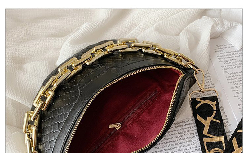 A delicada corrente usada como alça acrescenta um toque de elegância ao conjunto e permite transportá-la ao ombro ou na mão. O interior espaçoso da bolsa de cintura inclui bolsos práticos que facilitam a organização dos seus pertences pessoais.