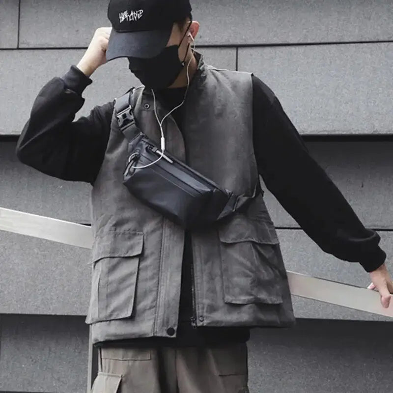 Mergulha num mundo de elegância e funcionalidade com esta bolsa de cintura preta. Fabricada em tecido Oxford impermeável, esta bolsa protege os teus essenciais mesmo em dias de chuva. Os múltiplos bolsos oferecem amplo espaço de arrumação e mantêm os teus pertences organizados e sempre à mão.