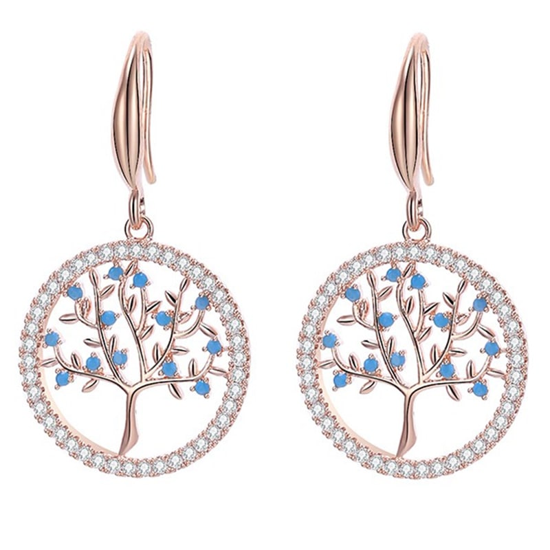 Estes belíssimos brincos em ouro rosa com o motivo da Árvore da Vida vão certamente impressionar! As folhas são adornadas com pequenos cristais azuis que realçam a sua delicadeza e beleza.