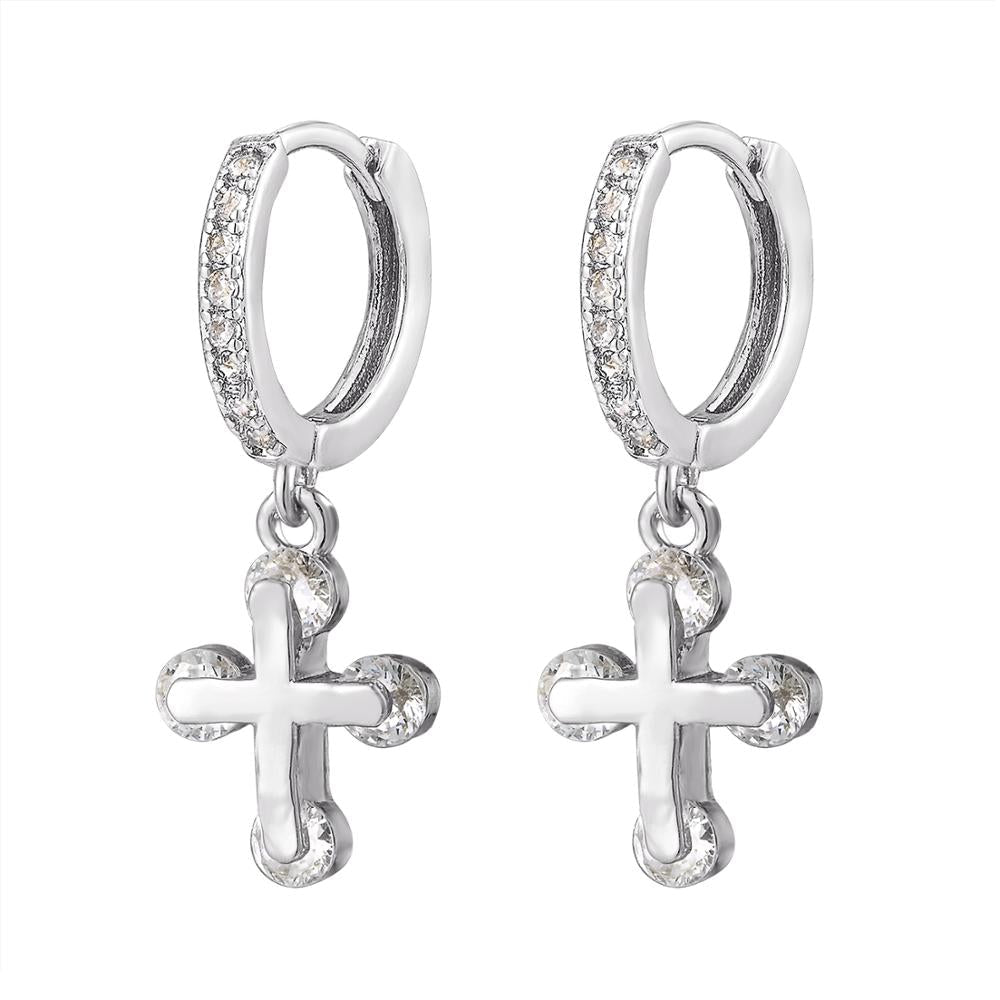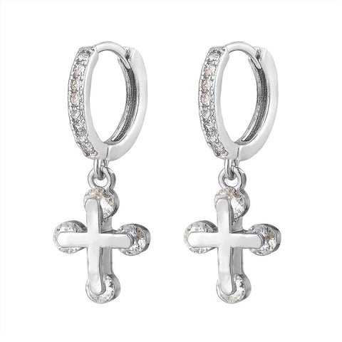 Deslumbrantes brincos femininos com cruz em aço inoxidável de alta qualidade. As quatro pontas das cruzes cristãs são adornadas com pedras cúbicas semelhantes a diamantes, enquanto elegantes pedras de zircónio decoram a borda exterior dos brincos.