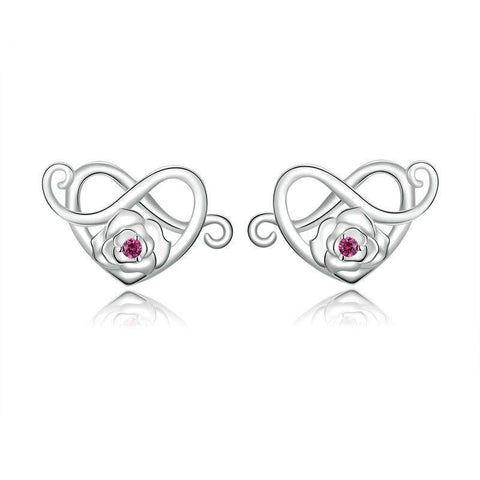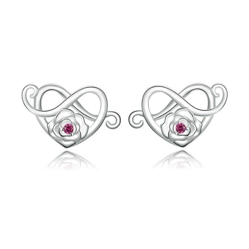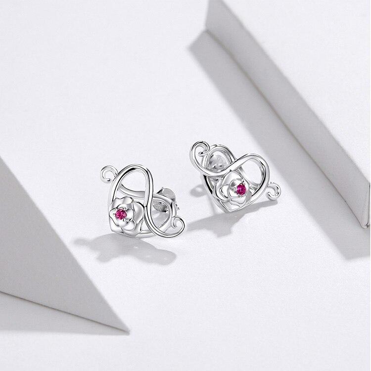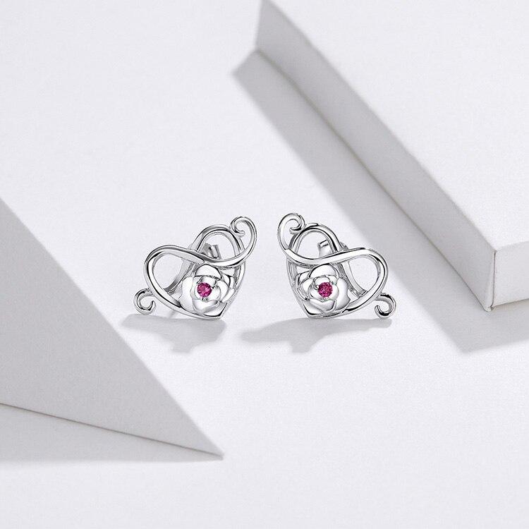 Este par de brincos de prata de alta qualidade tem a forma de um pequeno coração adornado com uma rosa. Além disso, cada rosa contém uma pequena pedra vermelha, conferindo aos brincos um toque luxuoso e feminino.