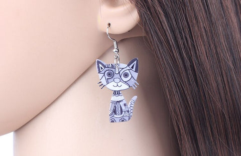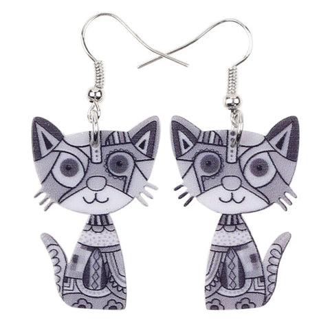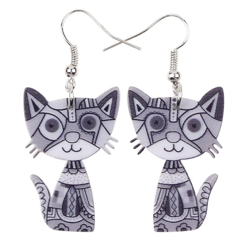 Estes deslumbrantes brincos em tons de cinzento, com um bonito padrão de mosaico, são perfeitos para todos os amantes de gatos.