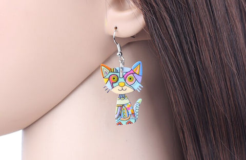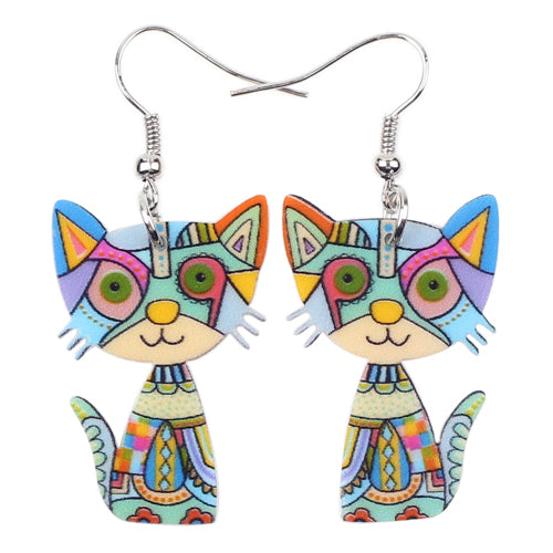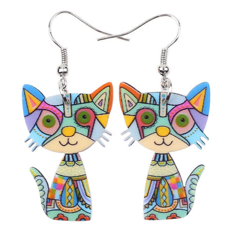 Se quiser adicionar um toque de cor ao seu visual, estes brincos em forma de mosaico predominantemente azul com motivo de gato são perfeitos.