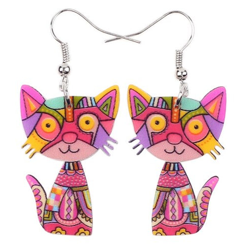 Os dois pequenos olhos amarelos e o mosaico de cores parcialmente rosa. A tua filha pode usar estes brincos que representam um gato.